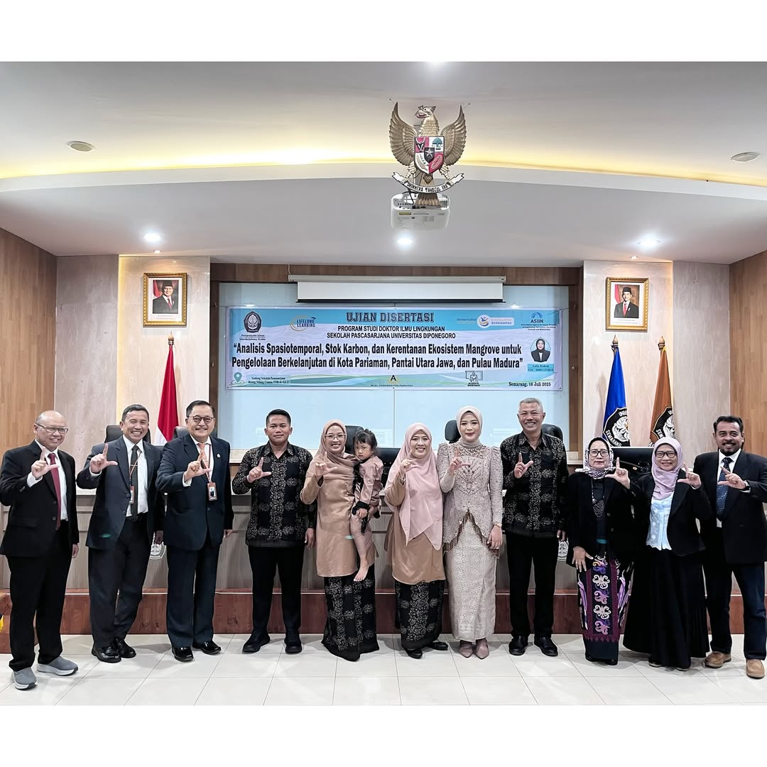 Telah berlangsung hari ini Ujian Disertasi mahasiswa Doktor Ilmu Lingkungan Sekolah Pascasarjana Undip a.n. Aulia Rahim dengan judul disertasi “Analisis Spasiotemporal, Stok Karbon, dan Kerentanan Ekosistem Mangrove untuk Pengelolaan Berkelanjutan di Kota Pariaman, Pantai Utara Jawa, dan Pulau Madura.”